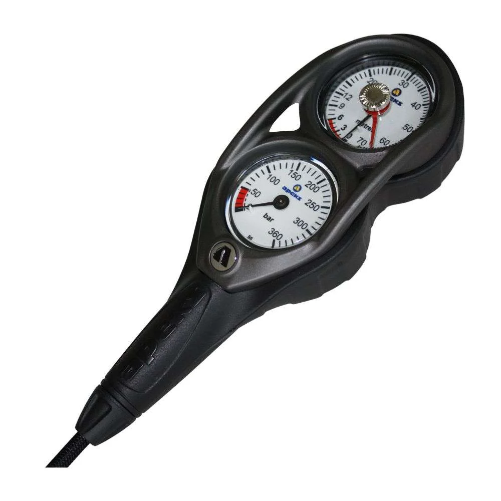 The 2-gauge console combines a submersible pressure (contents) gauge and a depth gauge housed in a specially designed case. The unit is completed with a high pressure hose. The console clearly displays your pressure and depth readings for easy viewing under water and the dials have a long phosphorescent effect for better reading in poor visibility conditions. The submersible pressure gauge provides accurate pressure readings with a range of 360 bar (imperial available up to 5000 psi). The depth gauge reads up to 70 m (imperial available to 230ft).